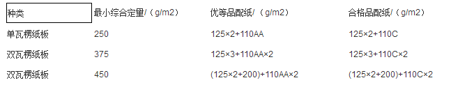 瓦楞纸板的最小综合定量在瓦楞纸板原纸配纸方案中就已考虑进去。例如表1的配纸方案: